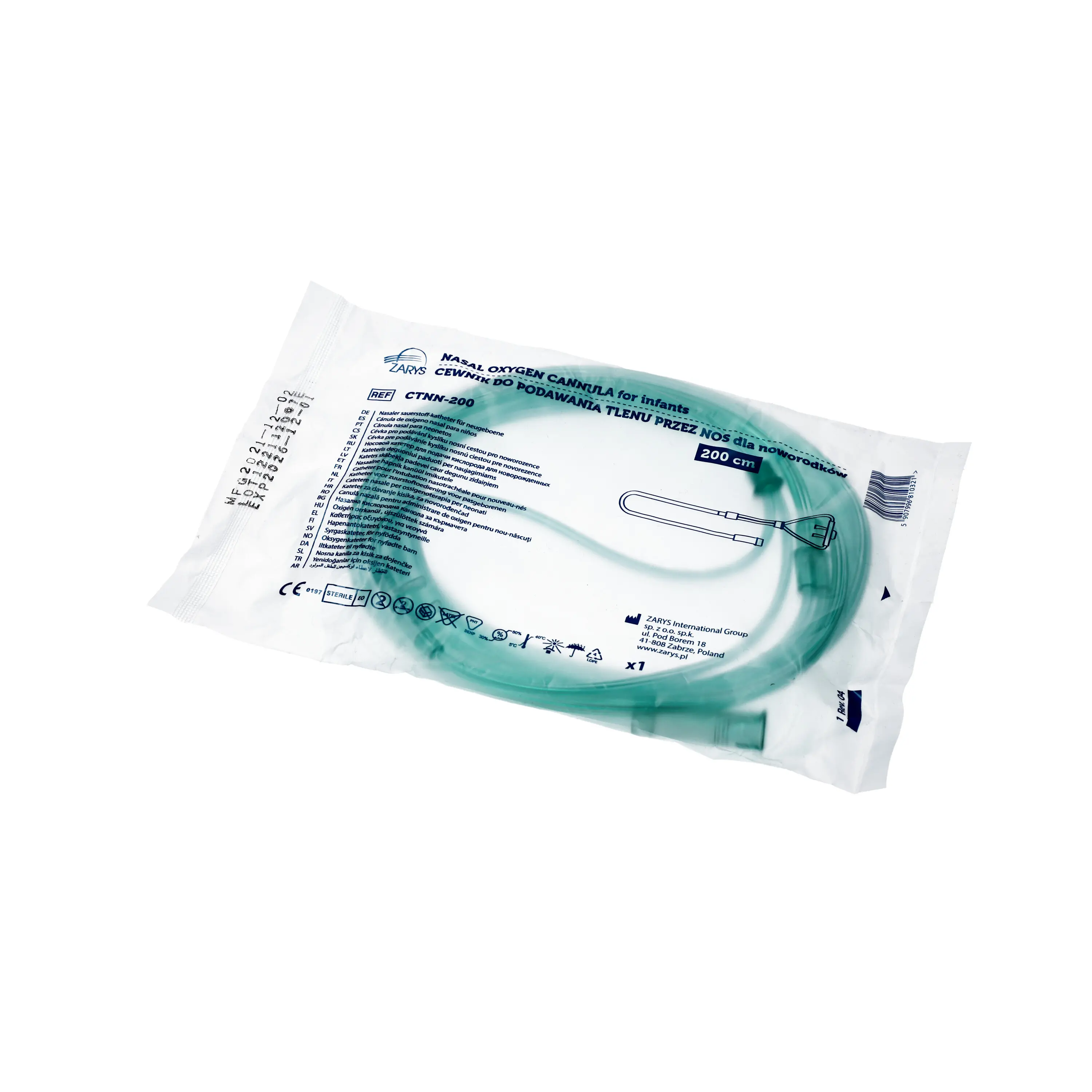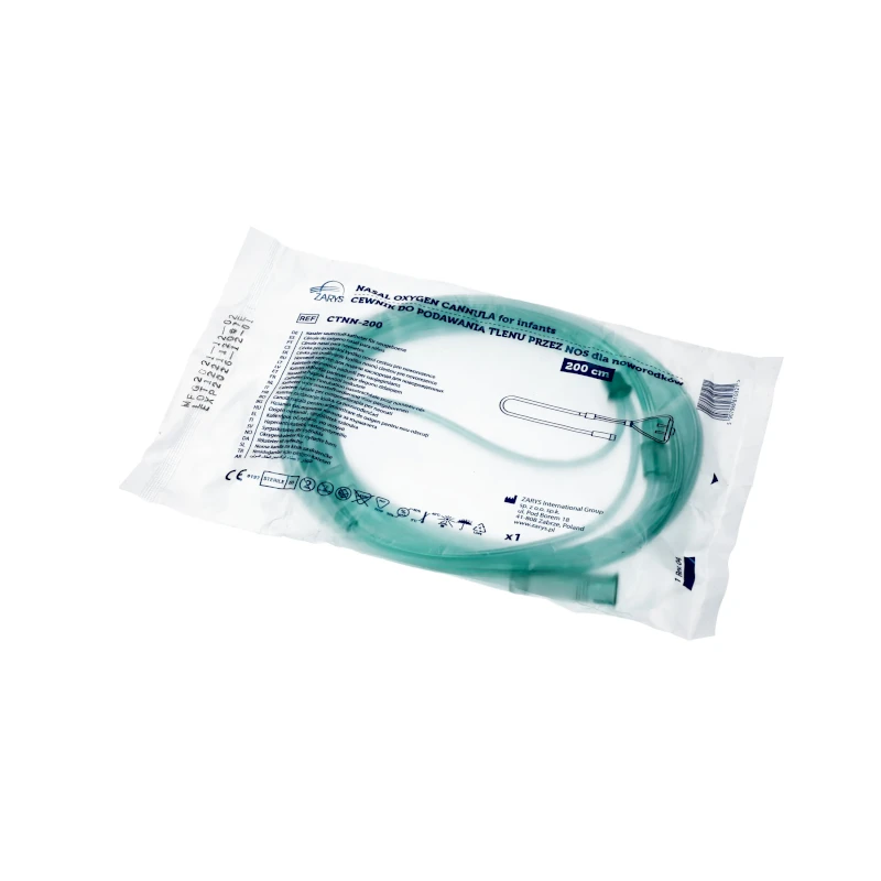 Jednorazový lekársky katéter bez latexu s jemnými špičkami a hladkými koncami, upevnený pod bradou so softovým, posuvným nastavovacím krúžkom. Produkt s rôznymi rozstupmi kanuly v nosovej časti, veľkosť pre novorodencov s dĺžkou hadičky 200 cm. Dizajn produktu obsahuje hadičku so hviezdicovým prierezom, odolnou voči ohybom, a univerzálny konektor kompatibilný s akýmkoľvek zdrojom kyslíka. Produkt je sterilizovaný oxidom etylenovým a určený na nosovú aplikáciu kyslíka novorodencom.