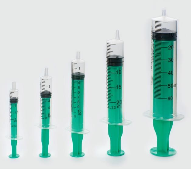 Injekčná striekačka s tryskou luer a s priehľadným valcom, vyrobená z polypropylénu, ktorý umožňuje dokonalú vizualizáciu obsahu. Striekačka je dostupná v transparentnej alebo jantárovej farbe, so zeleným kontrastným piestom. Piest plynule kĺže vďaka gumenému tesneniu. Obmedzenie príruby zabezpečujúce proti náhodnému vybratiu piestu. 3-dielna injekčná striekačka na intravenózne, intramuskulárne a podkožné injekcie a taktiež sú indikované na odber / aplikáciu liekov a na odber vzoriek telesných tekutín.