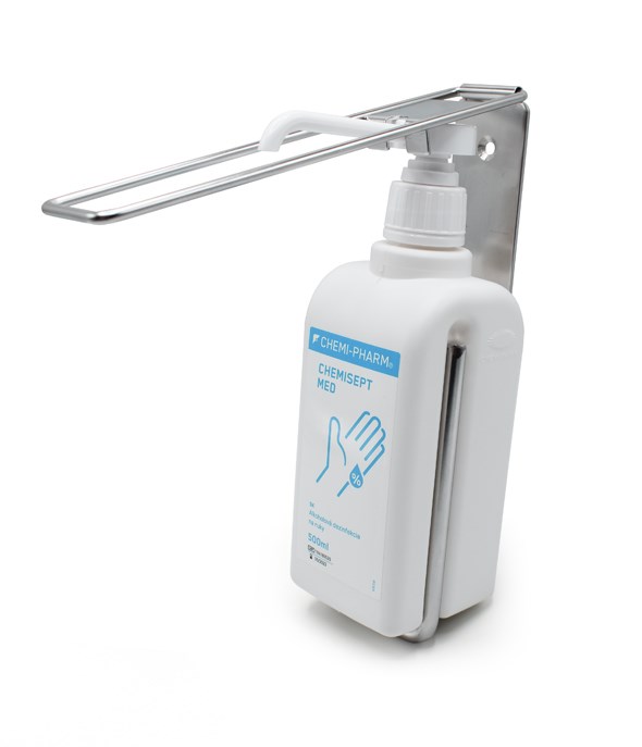 Mechanický kovový dávkovač na stenu ovládaný lakťom pre 500 ml fľaše Chemi-Pharm s pumpou - napr. Chemisept Med 500 ml s pumpou, Chemisept Gel 500 ml s pumpou, CP Wash Lotion 500 ml s pumpou, Bio Derm Care 500 ml s pumpou, Bio Care 500 ml s pumpou, Swell Extra 2% CHG 500 ml s pumpou, ...