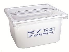 Trojdielna vaňa na nástroje s objemom 8l. Dezinfekčná vaňa sa skladá z troch dielov: priehľadné veko, vlastné telo vane, sito, ktoré je možné vybrať.