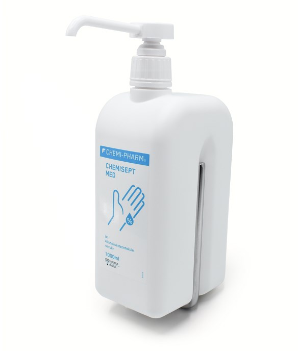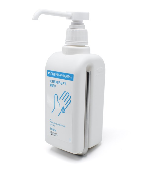 Univerzálny kovový držiak na stenu určený pre 500 ml a 1 l fľaše Chemi-Pharm s pumpou - napr. Chemisept Med 500 ml s pumpou, Chemisept Gel 500 ml s pumpou, CP Wash Lotion 500 ml s pumpou, Bio Derm Care 500 ml s pumpou, Bio Care 500 ml s pumpou, Chemisept Gel 1 l s pumpou, Chemisept Med 1 l s pumpou, CP Wash Lotion 1 l s pumpou, ...