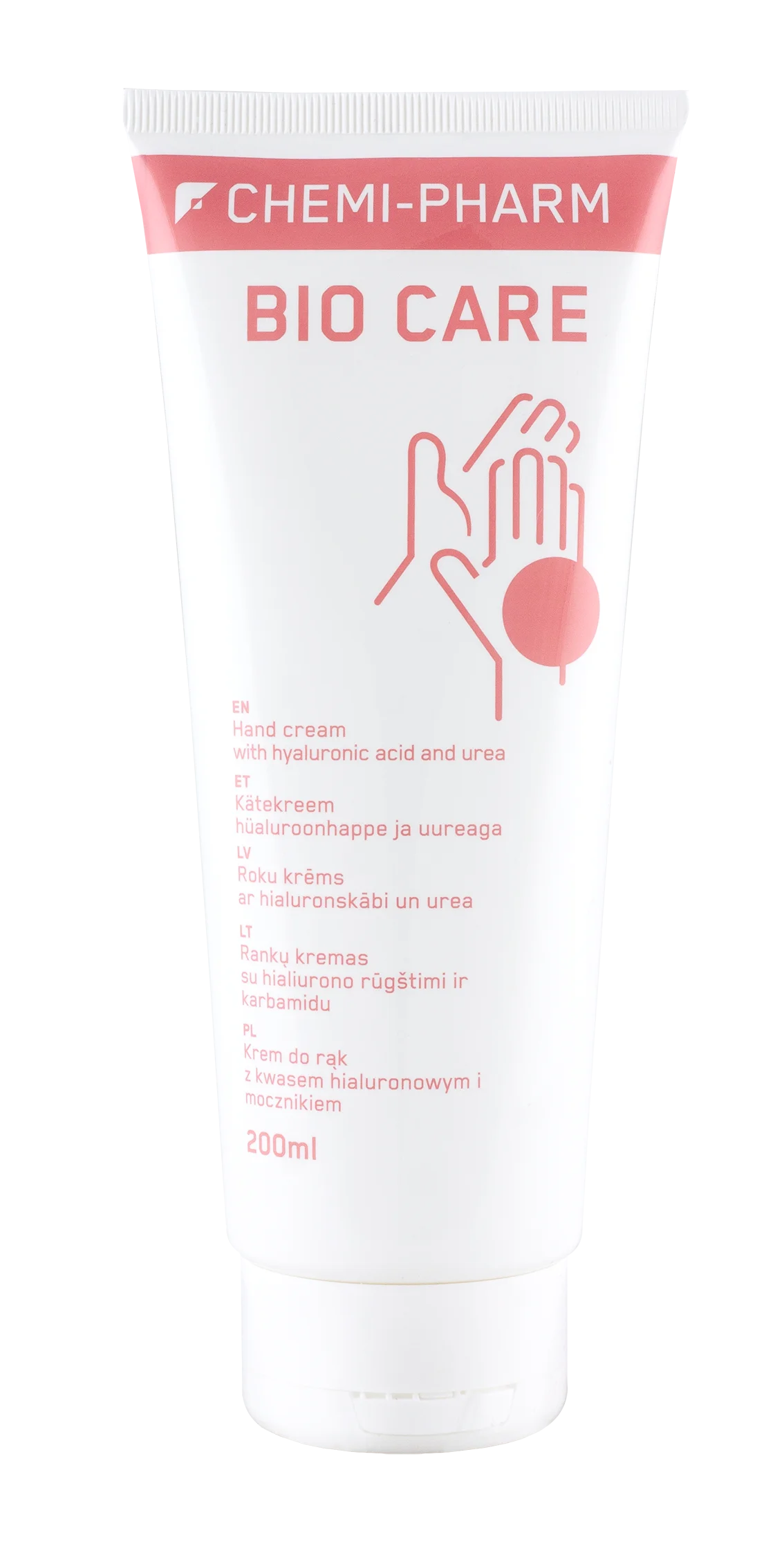 Bio Care je hydratačný a vyživujúci krém na ruky a pokožku s kyselinou hyalurónovou a močovinou. Zmes prírodných olejov s vitamínmi A, E a C upokojuje podráždenú pokožku a upevňuje regeneráciu pokožky prirodzeným obranným mechanizmom. Močovina a kyselina hyalurónová zabezpečujú dlhodobú hydratáciu suchých rúk a zanechávajú pokožku jemnú, hladkú a hodvábnu. Vhodný aj na citlivú pokožku.
