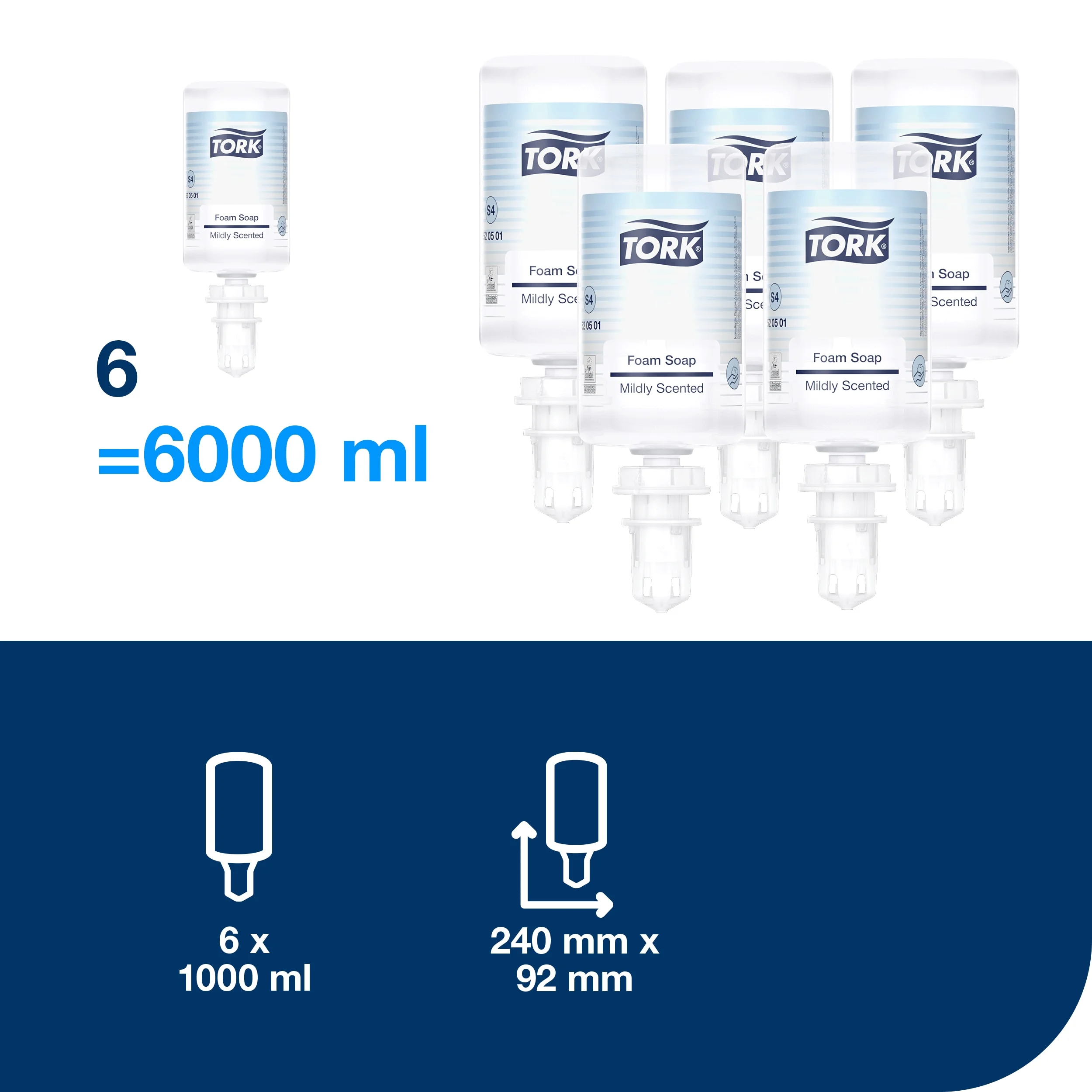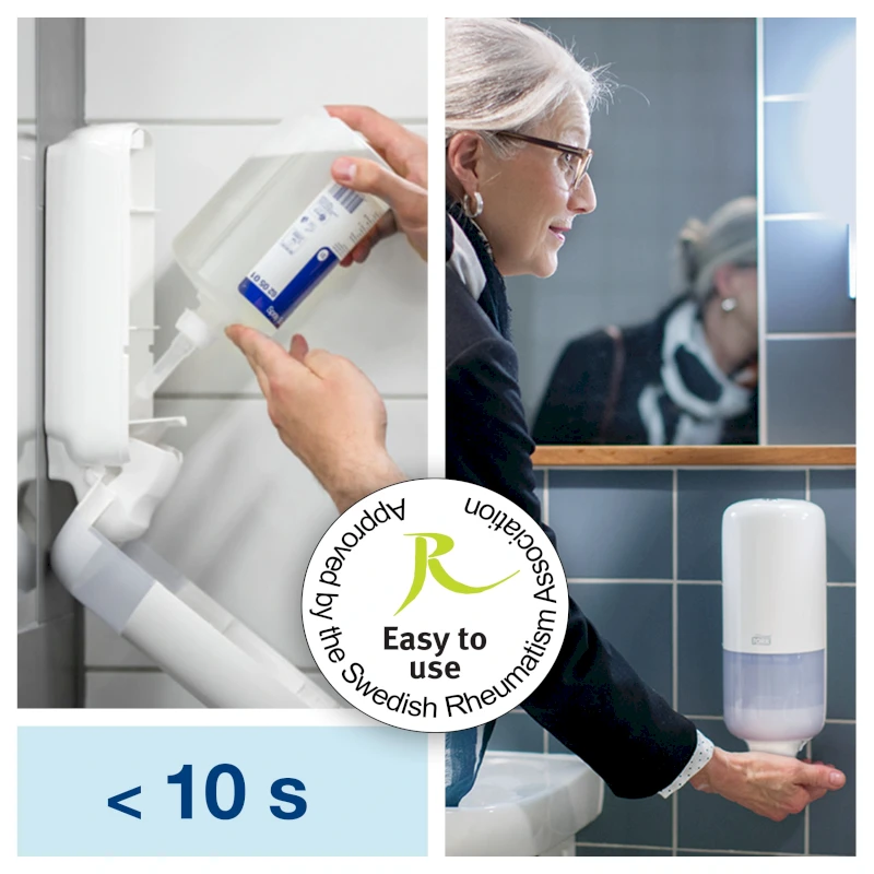 Tork jemne parfumované penové mydlo S4 poskytuje starostlivosť o normálnu a suchú pokožku na každodenné umývanie rúk. Mydlo má sviežu vôňu, hydratačné a regeneračné zložky a jemnú, krémovú penu na šetrné umývanie rúk. Šetrí čas upratovacieho personálu vďaka bezproblémovému naplneniu za menej ako 10 sekúnd. Táto náplň je vhodná pre dávkovače Tork S4, ktoré sú certifikované ako ľahko použiteľné a poskytujú dobrú hygienu rúk všetkým používateľom.