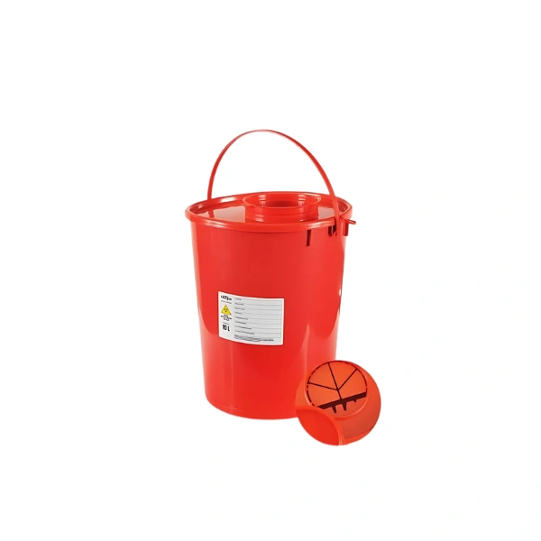 Nádoba na biologický odpad 10,0 L vybavená štítkom s výstrahou a s miestom pre uvedenie dôležitých informácií. Otvory vo veku umožňujú oddelenie ihly od striekačky.