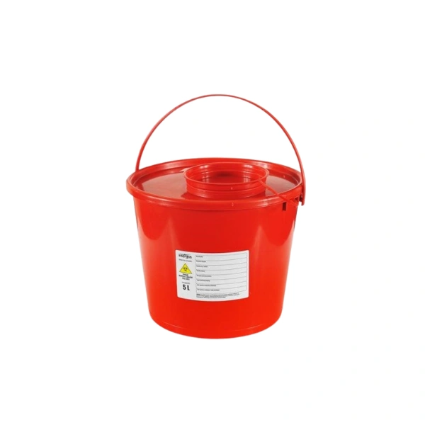 Nádoba na biologický odpad 5,0 L vybavená štítkom s výstrahou a s miestom pre uvedenie dôležitých informácií. Otvory vo veku umožňujú oddelenie ihly od striekačky.
