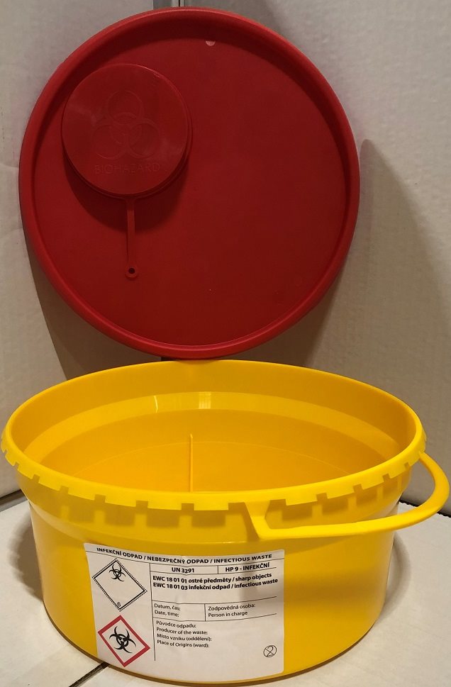 Nádoby určené k jednorazovému použitiu pre zber nebezpečného klinického odpadu v mieste jeho vzniku, ktorý patrí do triedy 6.2 (ADR) a sú priradené k UN 3291. Nádoby sú určené pre zber odpadov zo zdravotníctva zaradených do skupiny 18, vrátane jednorazových ihiel, skalpelu, pinet, sklenených črepov a pod. (katalógové číslo odpadu 18 01 01 01), ktoré vznikli pri činnosti všetkých typov zdravotníckych zariadení. Zárezy vo vrchnáku slúžia k sňatiu použitých injekčných ihiel bez dotyku ľudskej ruky. Praktické a vhodné pre každú lekársku prax, laboratória a pod. Boxy môžu byť plnené odpadom, jeho súčasťou sú i zbytky tekutín. Celkový obsah tekutín odpadu nesmie presahovať 5% z prípustnej plniacej hmotnosti. Pokiaľ túto hranicu presiahne, tak musí byt vždy k odpadu pridane dostatočné množstvo pohlcujúcej látky. Nesmú byť použité k zhromažďovaniu rádioaktívneho odpadu a odpadu obsahujúceho cytostatiká! Sú spáliteľné spolu s ich obsahom v špecializovaných spaľovniach a pri ich spaľovaní sa neuvoľňujú do ovzdušia žiadne životu a zdraviu nebezpečné látky.
