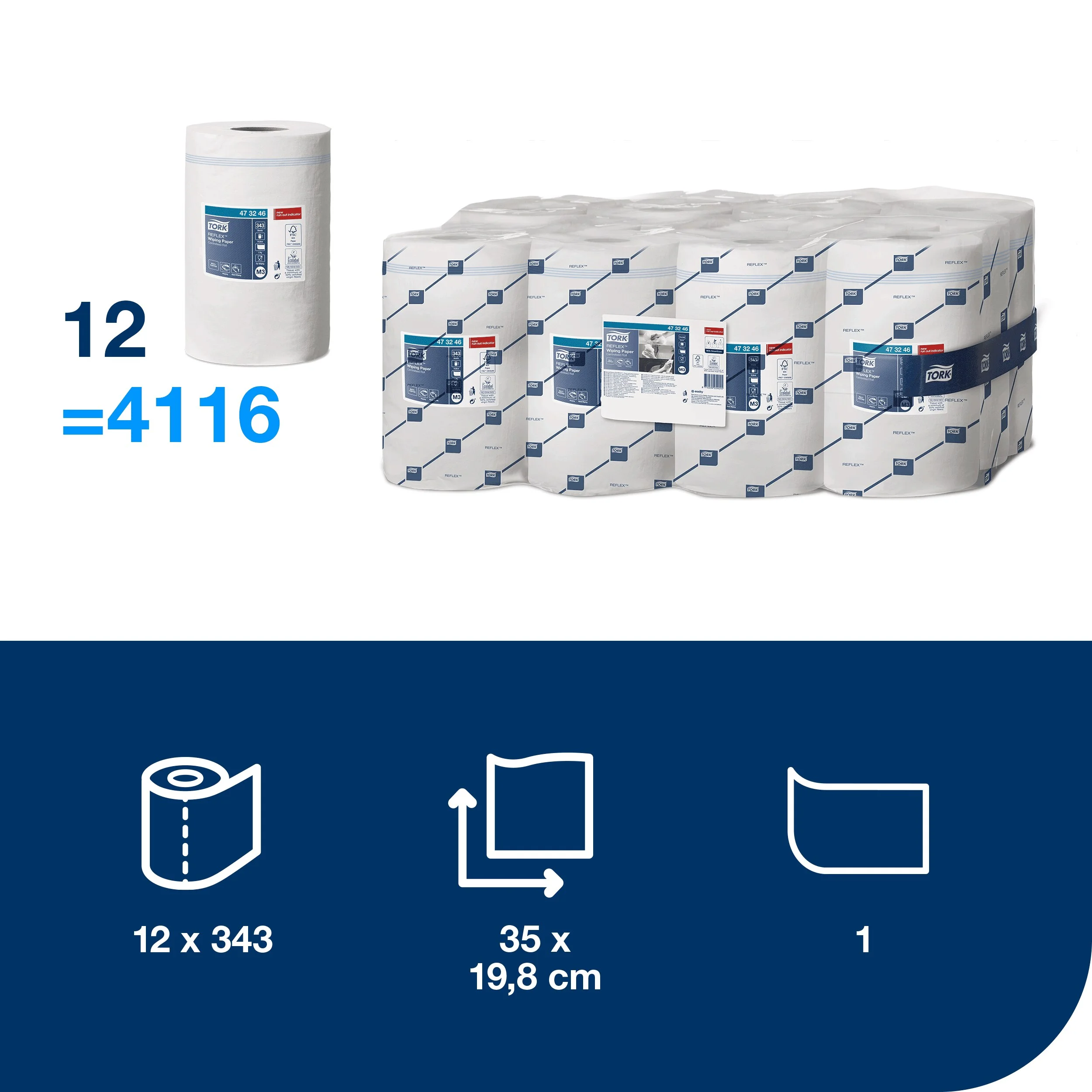 1-vrstvová viacúčelová papierová utierka Tork Reflex™ je vďaka svojej pevnosti a vysokej absorpcii ideálna na utieranie povrchov a rúk. Tento papier možno používať v dávkovači Tork Mini Reflex™ so stredovým podávaním na jeden útržok, ktorý znižuje spotrebu o 37% v porovnaní s papierom na utieranie Tork Wiping Paper Plus s voľným odvíjaním.