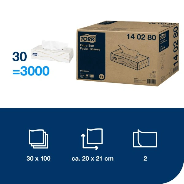 - 30 škatuliek, každá obsahuje 100 vreckoviek. 2 vrstvy. Prémiová kvalita. Rozložená veľkosť: dĺžka 20,8 cm, šírka 20 cm. Zložená veľkosť: dĺžka 10,4 cm, šírka 20 cm. Kompatibilné s dávkovačmi F1.