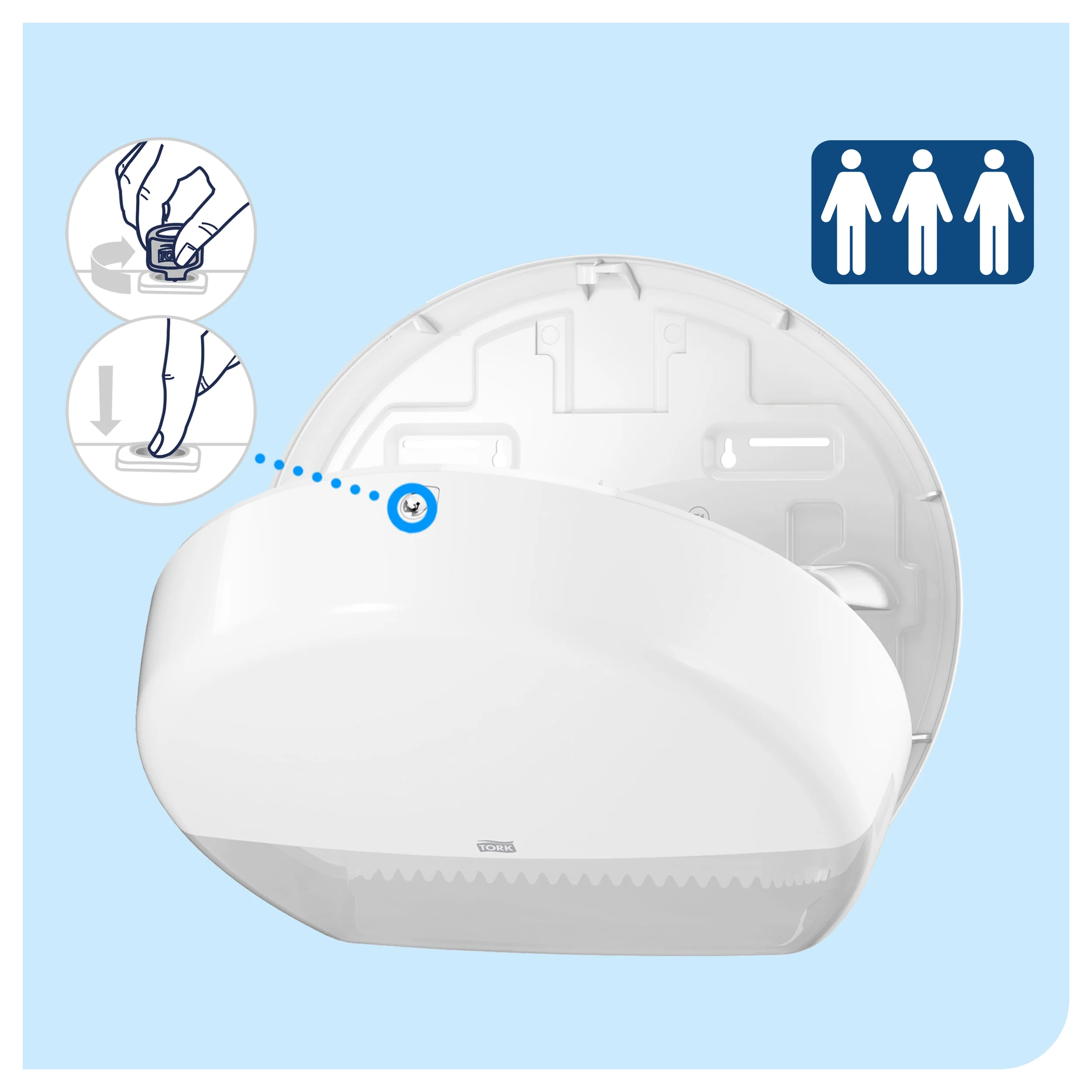 Zásobník na toaletný papier Tork Jumbo v dizajne Elevation je vhodný na miesta s vysokou návštevnosťou. Jeho mimoriadne vysoká kapacita šetrí čas potrebný na údržbu a zabezpečuje, že papier je vždy k dispozícii. Zásobníky Tork majú funkčný, moderný dizajn, ktorý na vašich hostí zanechá dobrý dojem.