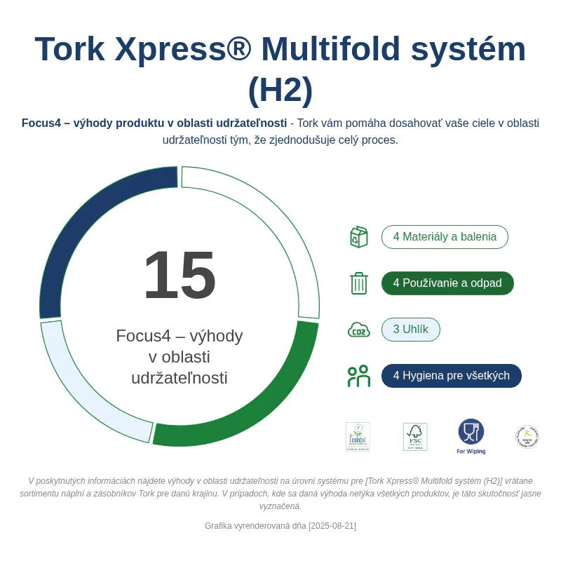 S Tork PeakServe® zásobníkom na utierky na ruky sa vyhnete zápcham v umyvárni a nedostatku papierových utierok. Je ideálny pre toalety s vysokou návštevnosťou a využíva stlačené utierky na ruky, aby poskytol o 250 % väčšiu kapacitu v tenkom dizajne, ktorý vyhovuje požiadavkám ADA. Efektívny a flexibilný systém dopĺňania šetrí čas personálu, pretože umožňuje kedykoľvek doplniť zásobník. Navyše plynulý a jednoduchý patentovaný systém Continuous™ zlepšuje priechodnosť v umyvárni, pretože vydáva papierové uteráky Tork len za tri sekundy. Uhlíkovo neutrálny - vyrába sa z certifikovanej obnoviteľnej elektrickej energie a kompenzuje sa klimatickými projektmi.Výhody:
