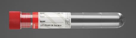 Skúmavka sterilná, polystyrénová s červeným uzáverom, cylindrická, so štítkom.