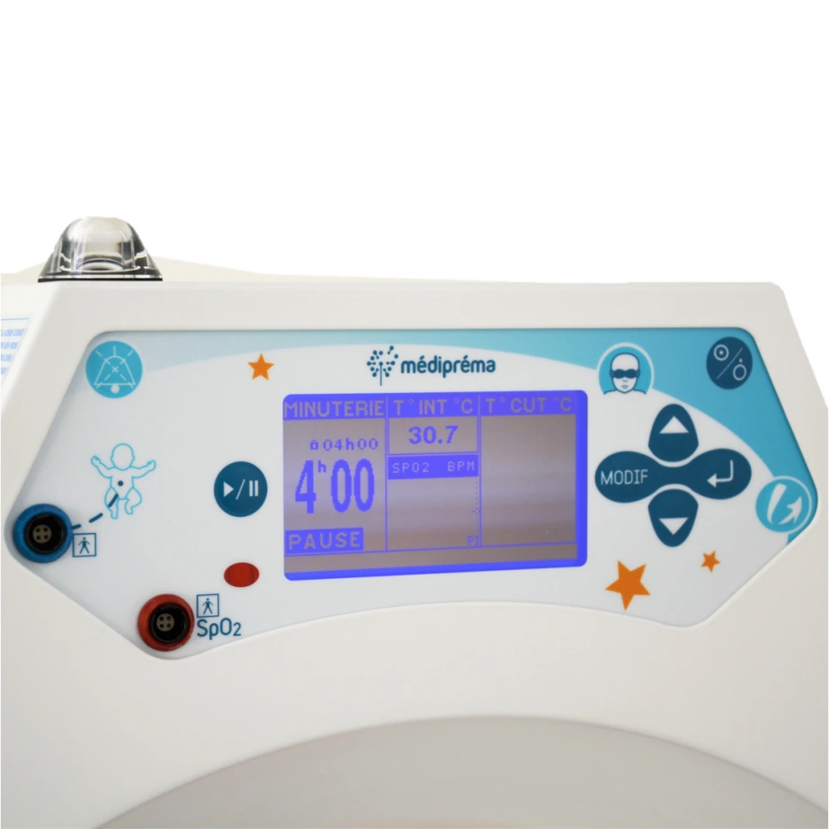 OVLÁDACÍ PANEL s displejom v úrovni očí pre dobrú viditeľnosť parametrov a alarmov Programovanie doby expozície. Časovač pre celkový čas používania LED diód a zariadenia. Tlačidlo pauzy umožňujúce prerušiť liečbu počas manipulácie s dieťaťom.