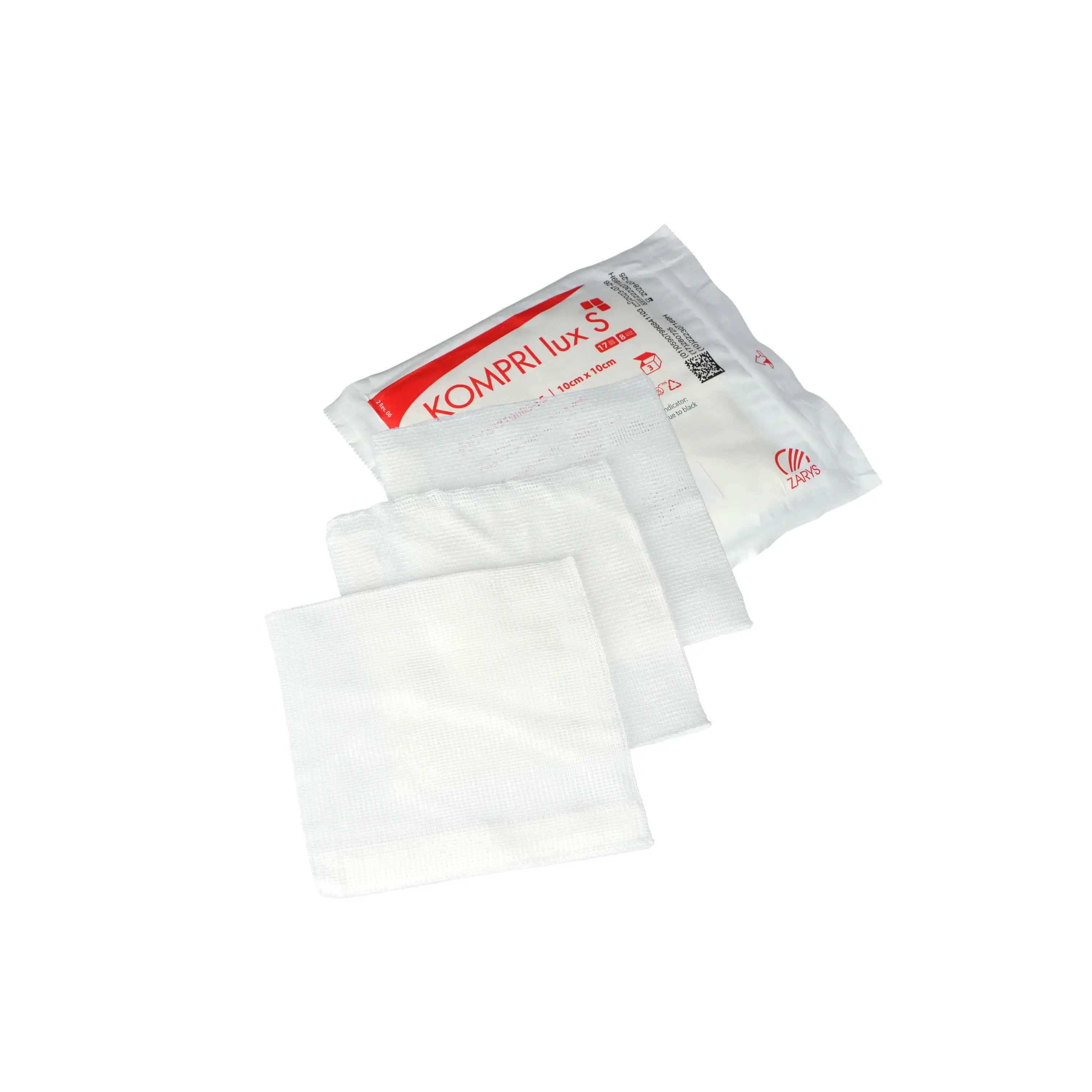 Gázové sterilné kompresy s rozmerom 10 x 10 cm.Vyrobené z hydrofilnej bavlnenej gázy bielenej peroxidom vodíka (bez chlóru). Okraje sú dvojito založené, bez strapkania. Jemné s vysokou savosťou. Vhodné na očistenie alebo krytie znečistených rán, v nemocniciach na klinikách a v ambulanciách.