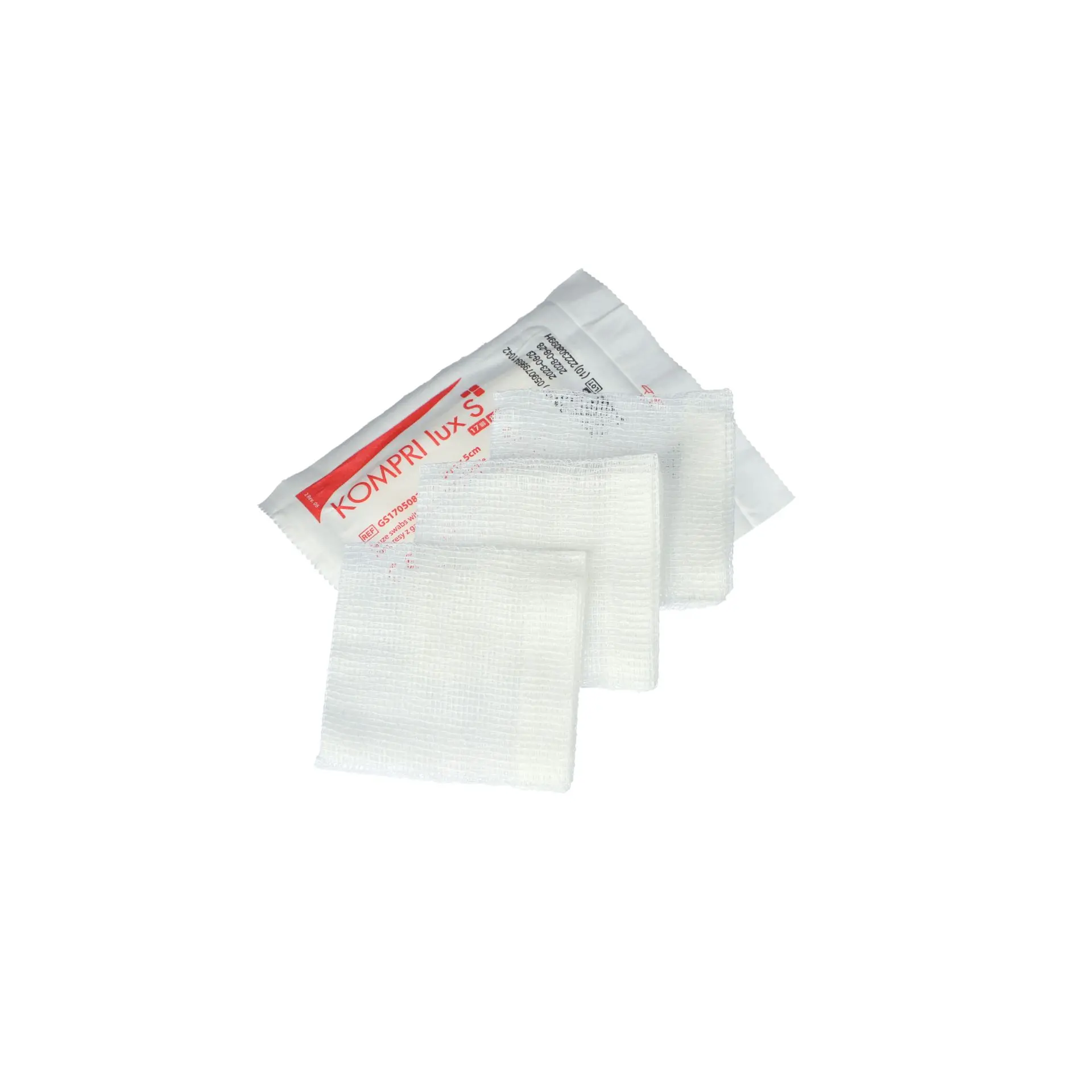 Gázové sterilné kompresy s rozmerom 5 x 5 cm.Vyrobené z hydrofilnej bavlnenej gázy bielenej peroxidom vodíka (bez chlóru). Okraje sú dvojito založené, bez strapkania. Jemné s vysokou savosťou. Vhodné na očistenie alebo krytie znečistených rán, v nemocniciach na klinikách a v ambulanciách.