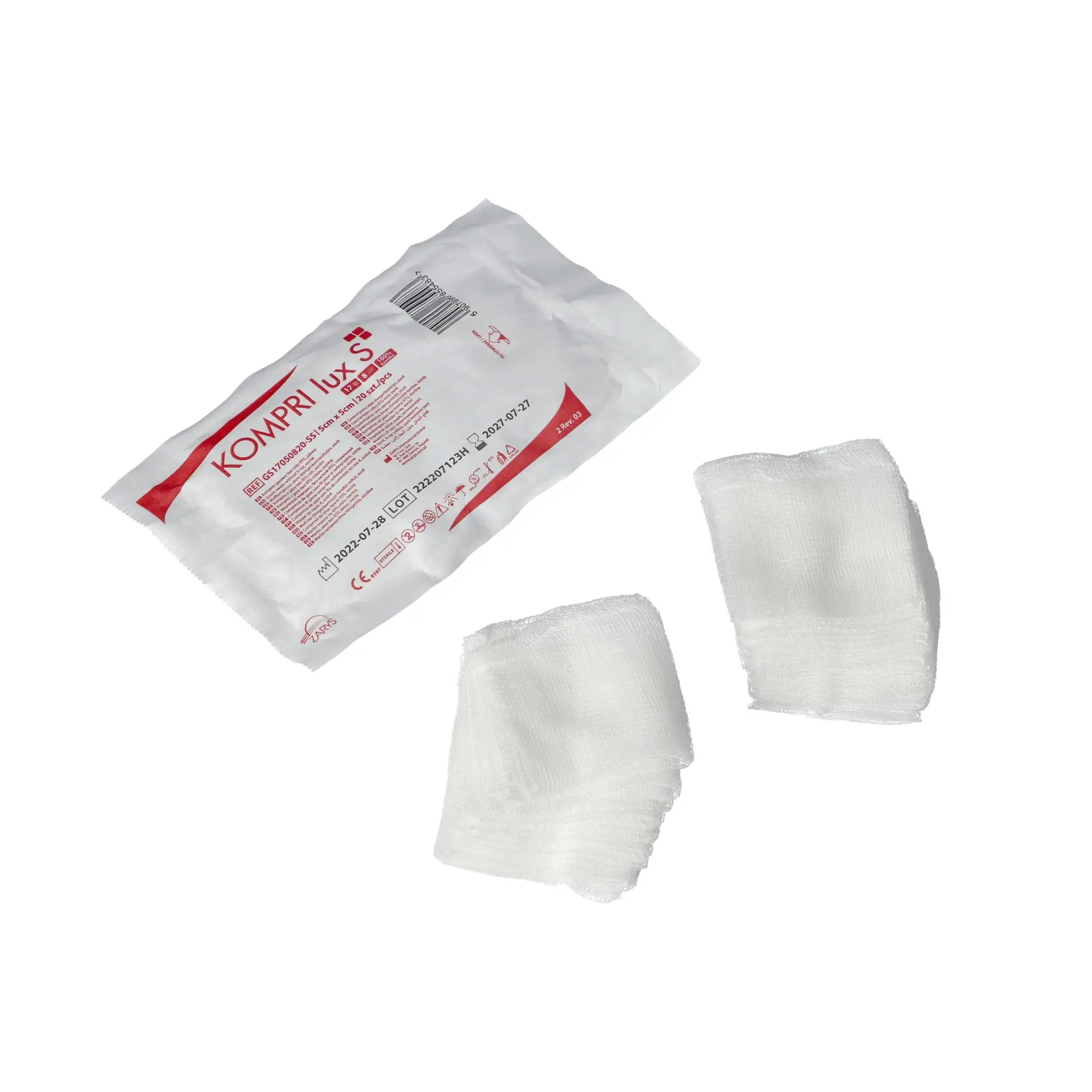 Gázové sterilné kompresy s rozmerom 5 x 5 cm.Vyrobené z hydrofilnej bavlnenej gázy bielenej peroxidom vodíka (bez chlóru). Okraje sú dvojito založené, bez strapkania. Jemné s vysokou savosťou. Vhodné na očistenie alebo krytie znečistených rán, v nemocniciach na klinikách a v ambulanciách.