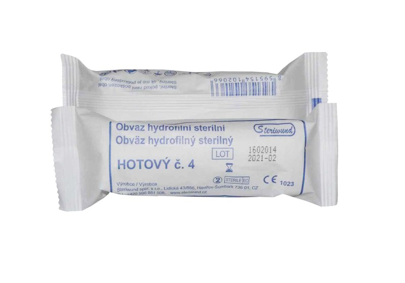 Pletený hydrofilný obväz zo 100% viskózovej striže v rolke s pevne fixovaným savým kompresom z netkaného textilu, rozmer 10cm x 5m. Obväz je vhodný na ošetrovanie a krytie rán. Používa sa najmä v lekárničkách. Obal je z papiera.