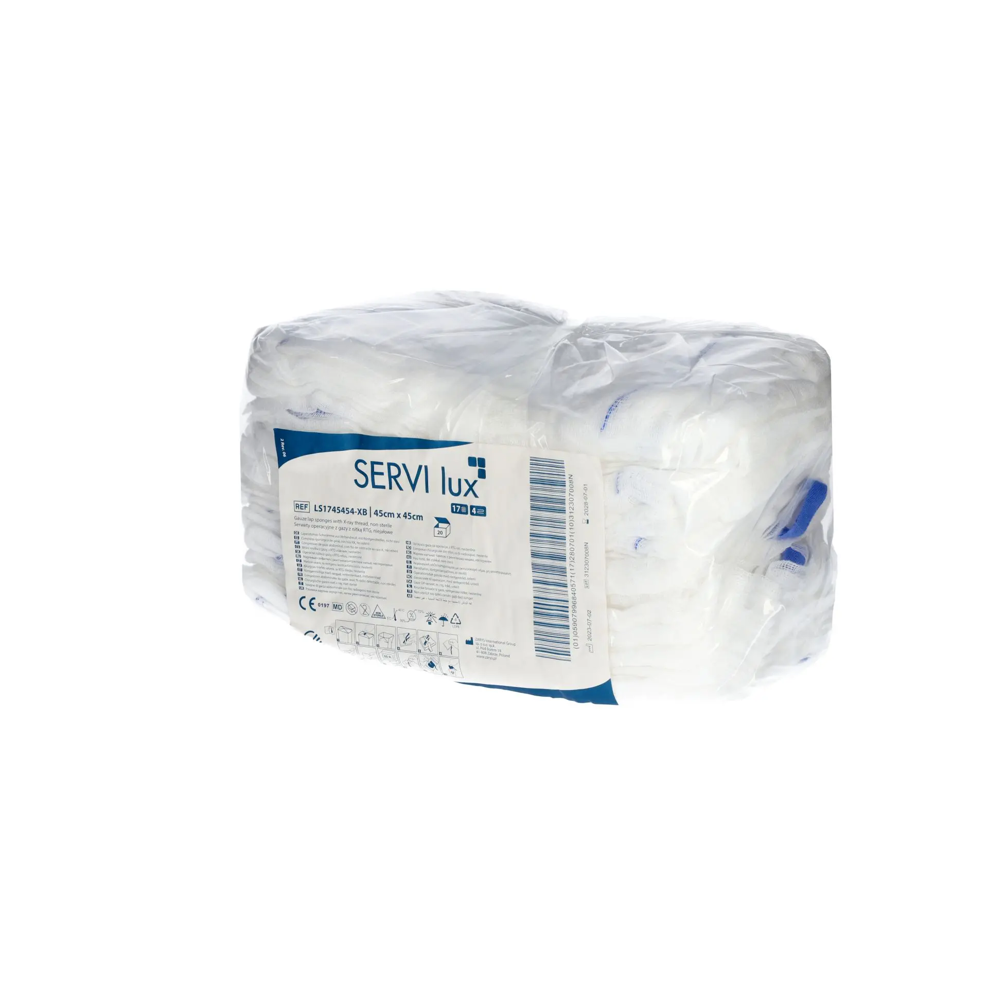 Brušný nepredpraný tampón s rozmerom 45cm x 45cm. Tampón je vyrobený zbielenej gázy zo 100 % bavlny. Gáza je tkaná v počte 17 nití/cm2, čo zaručuje jej vysokú savosť. Pre ľahšiu detekciu pod röntgenovým zariadením je tampón opatrený RTG vláknom. Tampón pozostáva zo štyroch vrstiev prešitých do kríža, čo zvyšuje jeho pevnosť. Tkanica uľahčuje manipuláciu s tampónom. Kvôli väčšiemu objemu a mäkkosti môže byť tampón predpraný.
