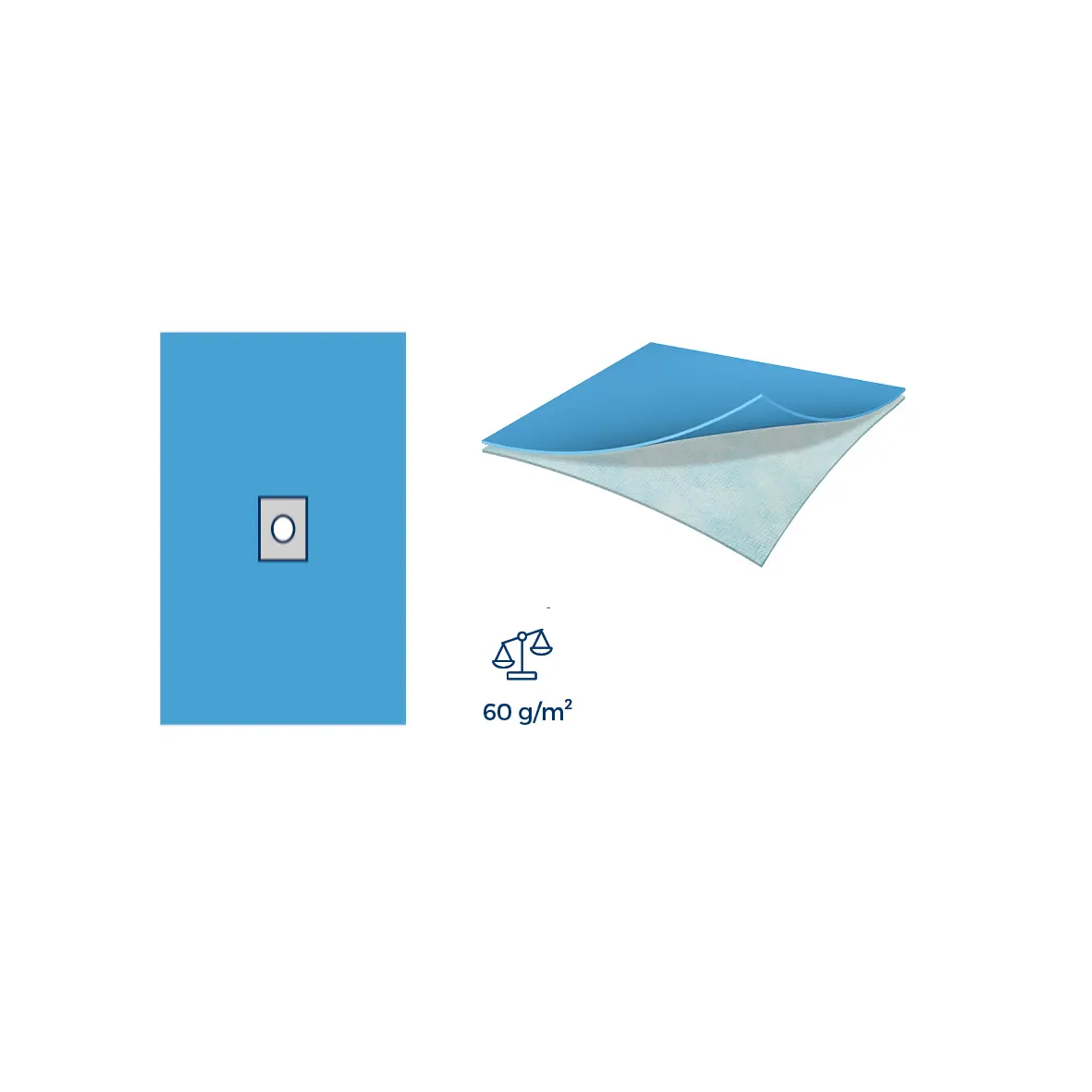 Dvojvrstvové operačné rúško s centrálnym adhezívnym otvorom.