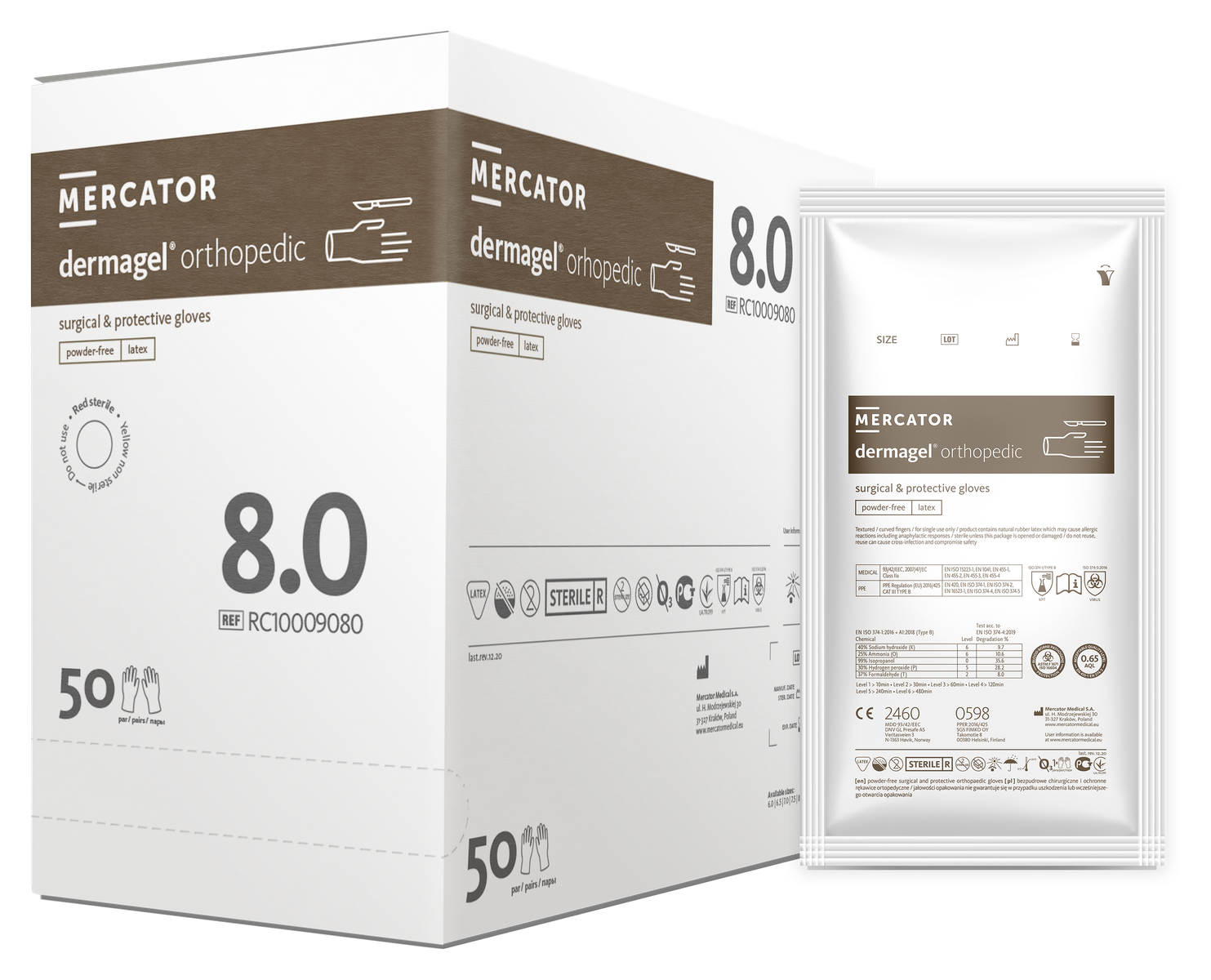Chirurgické rukavice Dermagel Orthopedic sú odporúčané najmä na ortopedické zákroky. Vyrobené sú z prírodného latexu, nepudrované a v hnedej farbe. Rukavice majú textúrovaný povrch pre lepšiu priľnavosť, sú zvonka chlorované a zvnútra potiahnuté polymérom, čo uľahčuje ich navliekanie na suché aj vlhké ruky.