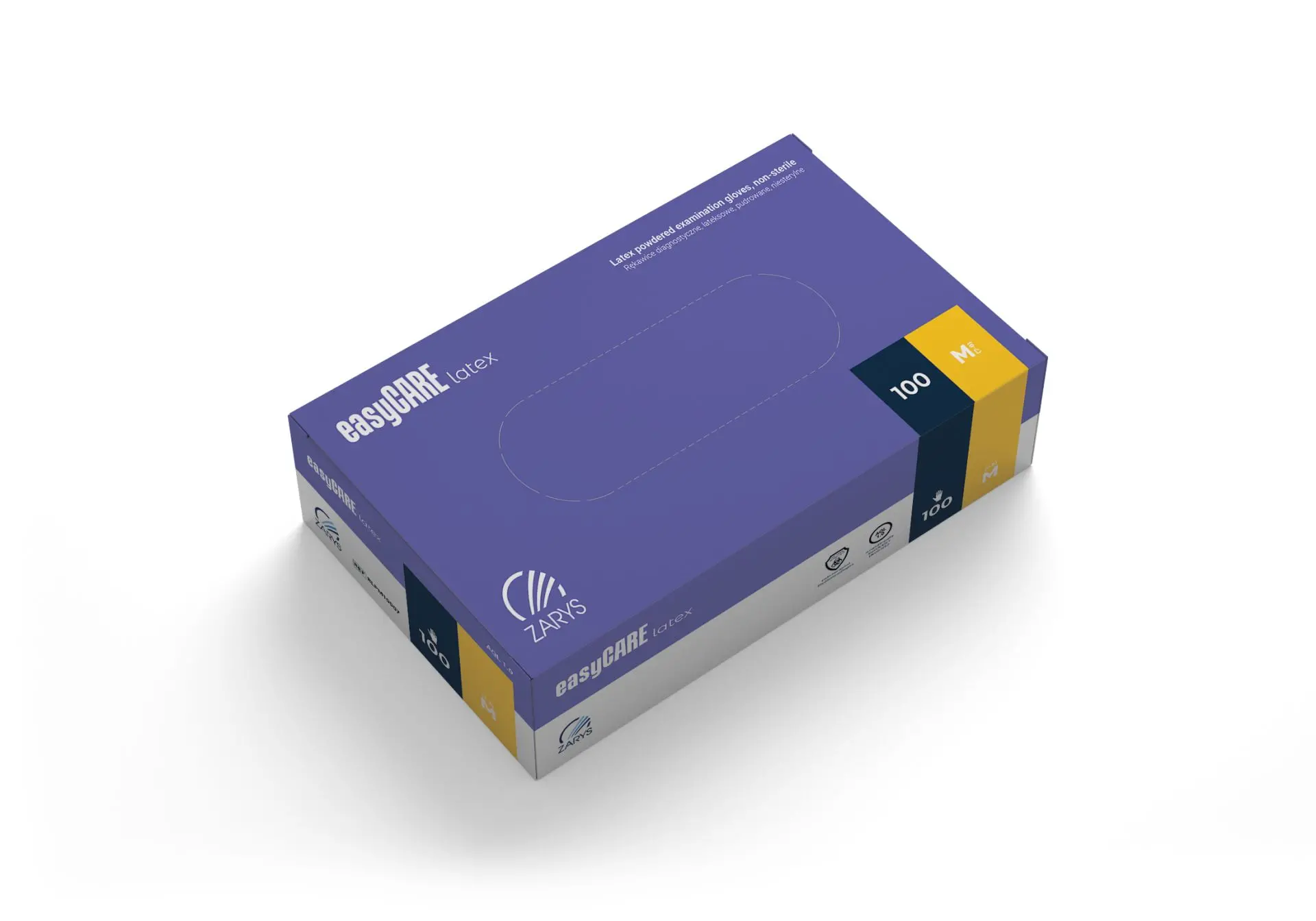 Jednorazové vyšetrovacie rukavice easyCARE s manžetou s rolovaným okrajom, vyrobené z prírodného latexu, púdrované. Produkt má textúrovaný povrch po celej ploche dlane a prstov. Ide o nesterilnú pomôcku, ktorá spĺňa technické normy, je povolené na kontakt s potravinami, určené na diagnostiku pacientov, poskytujúce bariéru na prenos mikroorganizmov, čím minimalizuje riziko krížovej kontaminácie.