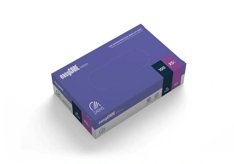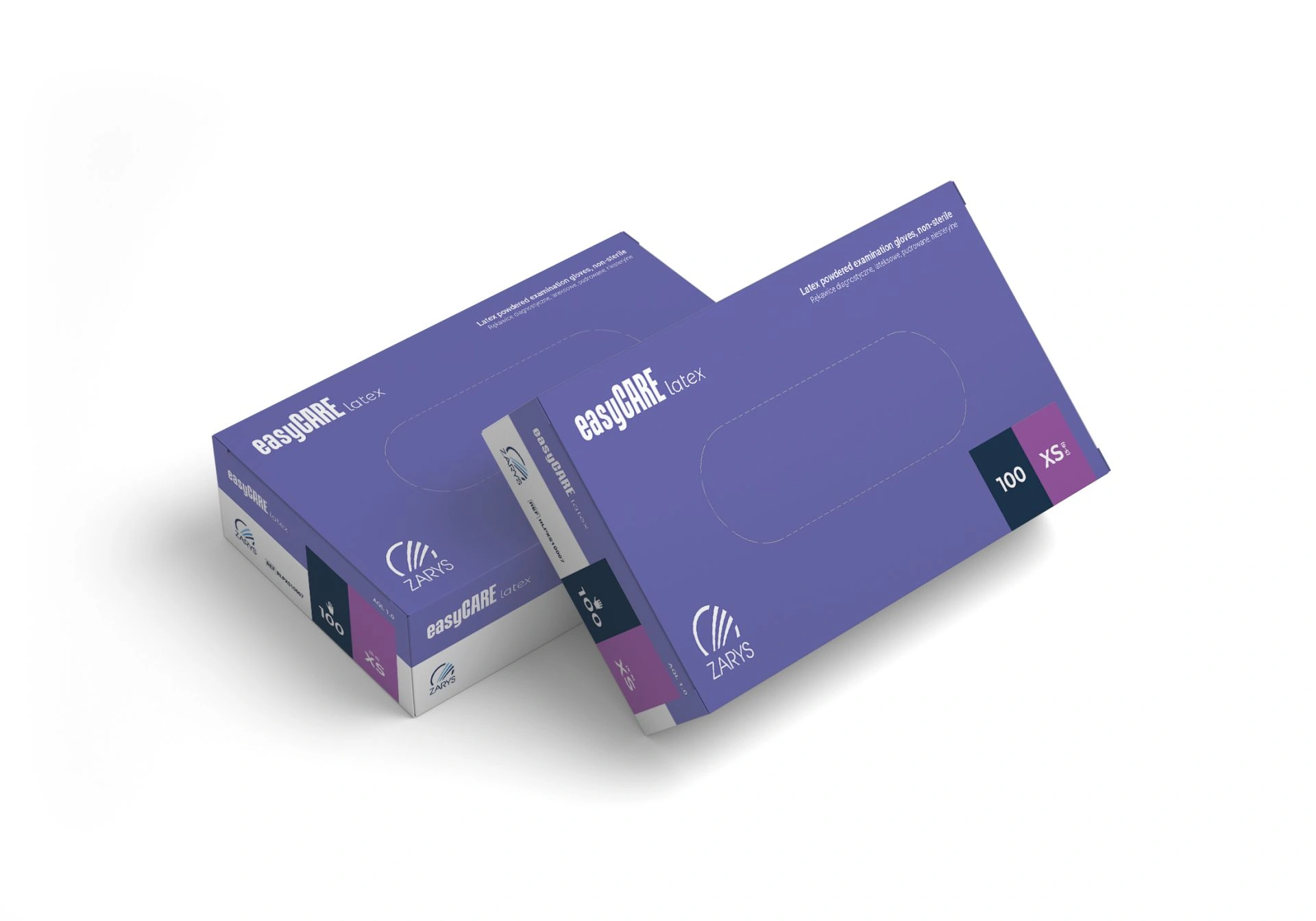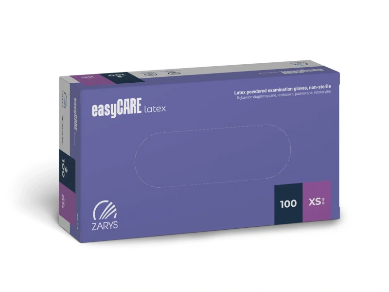 easyCARE jednorazové vyšetrovacie rukavice s manžetou, vyrobené z prírodného kaučuku latexu, poprášené kukuričným škrobom. Produkt má textúrovaný povrch po celej dlaní a prstoch. Nesterilné, práškové rukavice, ktoré spĺňajú technické normy a sú povolené na kontakt s potravinami. Určené na diagnostiku pacientov, poskytujú ochrannú bariéru proti prenosu mikroorganizmov medzi operátorom a pacientom a minimalizujú riziko krížovej kontaminácie.