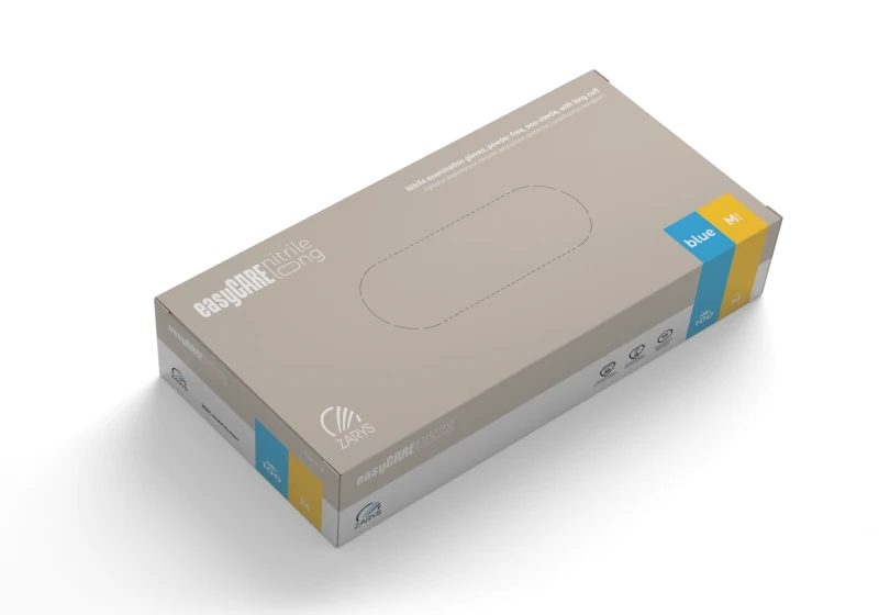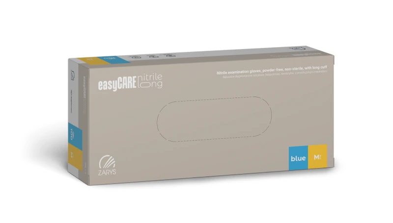 Rukavice easyCARE vyrobené z nitrilu, s rolovaným lemom, polymerizované po celej dĺžke. Vonkajšia strana je mikrotextúrovaná po celej dlani, s dodatočnou textúrou na končekoch prstov. Jednorazová pomôcka, vyhovujúca technickým normám, schválená na kontakt s potravinami, určená na diagnostiku pacientov, poskytujúca bariéru proti prenosu mikroorganizmov medzi operátorom a pacientom, minimalizujúca riziko krížovej kontaminácie. Odporúča sa používať počas zákrokov s vysokým rizikom infekcie.