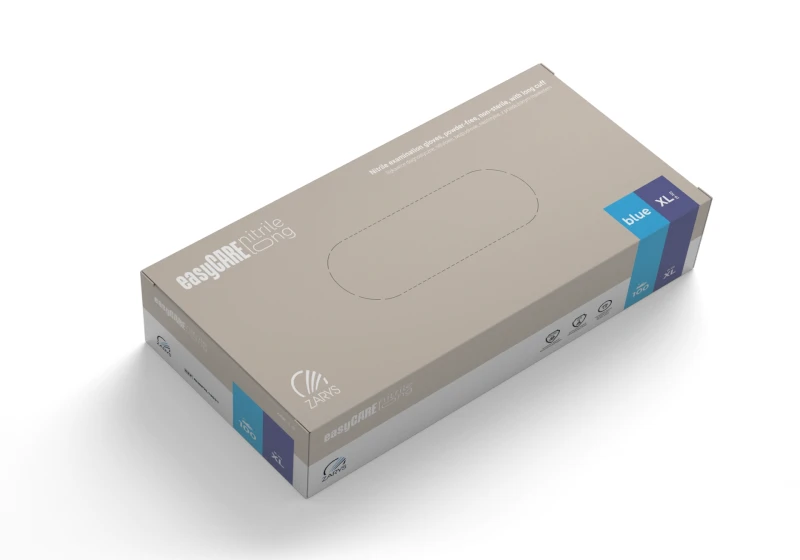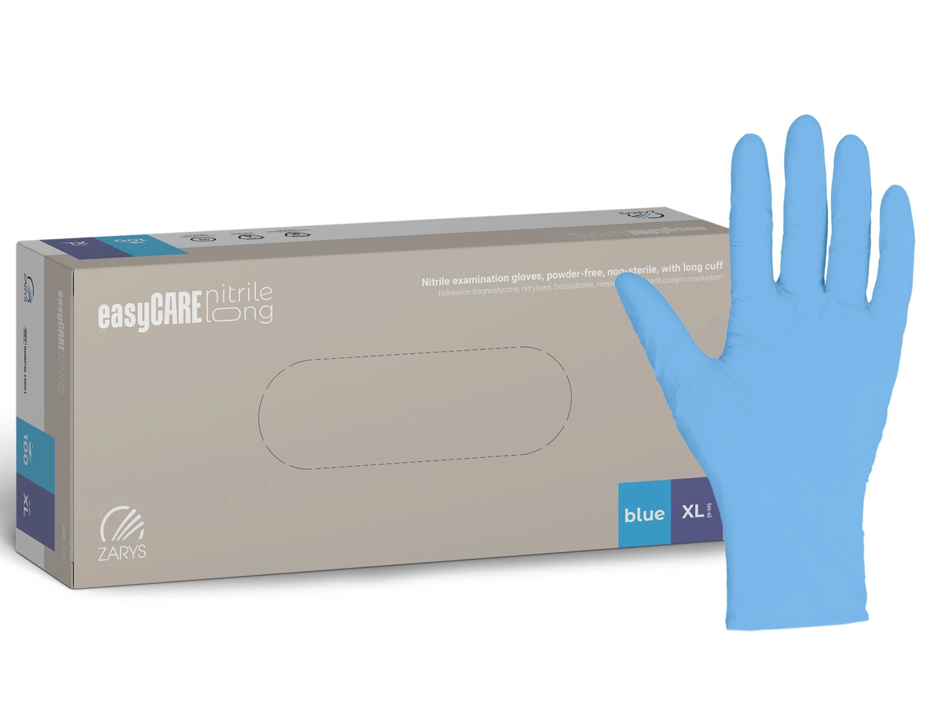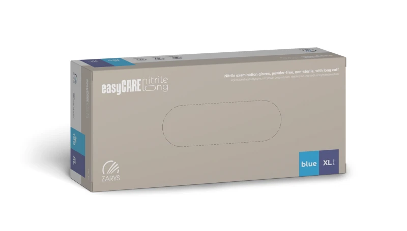 Rukavice easyCARE vyrobené z nitrilu, s rolovaným lemom, polymerizované po celej dĺžke. Vonkajšia strana je mikrotextúrovaná po celej dlani, s dodatočnou textúrou na končekoch prstov. Jednorazová pomôcka, vyhovujúca technickým normám, schválená na kontakt s potravinami, určená na diagnostiku pacientov, poskytujúca bariéru proti prenosu mikroorganizmov medzi operátorom a pacientom, minimalizujúca riziko krížovej kontaminácie, odporúčaná počas zákrokov s vysokým rizikom infekcie.