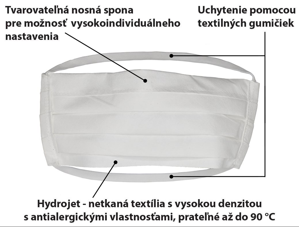 Hygienická textilná tvárová maska (rúško) je vyrobená z netkanej textílie Hydrojet s vysokou hustotou a antialergickými vlastnosťami. Fixácia masky je zabezpečená pomocou textilných gumičiek s uchytením za hlavu a tvartovateľnej nosnej spony.