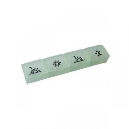 Dávkovač na lieky na 1 deň. Každý deň je rozdelený na 4 časti: ráno x obed x večer x noc. Každá časť dňa sa otvára samostatne pomocou viečka, zatiaľ čo ostatné časti zostávajú dôkladne uzavreté.