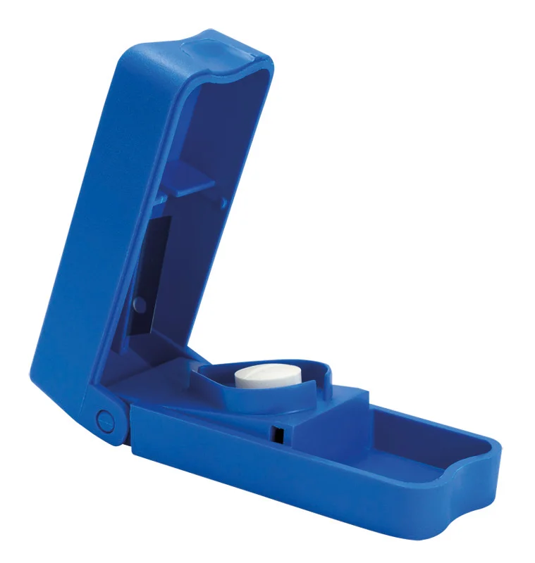 Delič tabliet na jednoduché rozdelenie tablety na polovicu. Obsahuje ostrú čepeľ a odkladací priestor na tabletky.