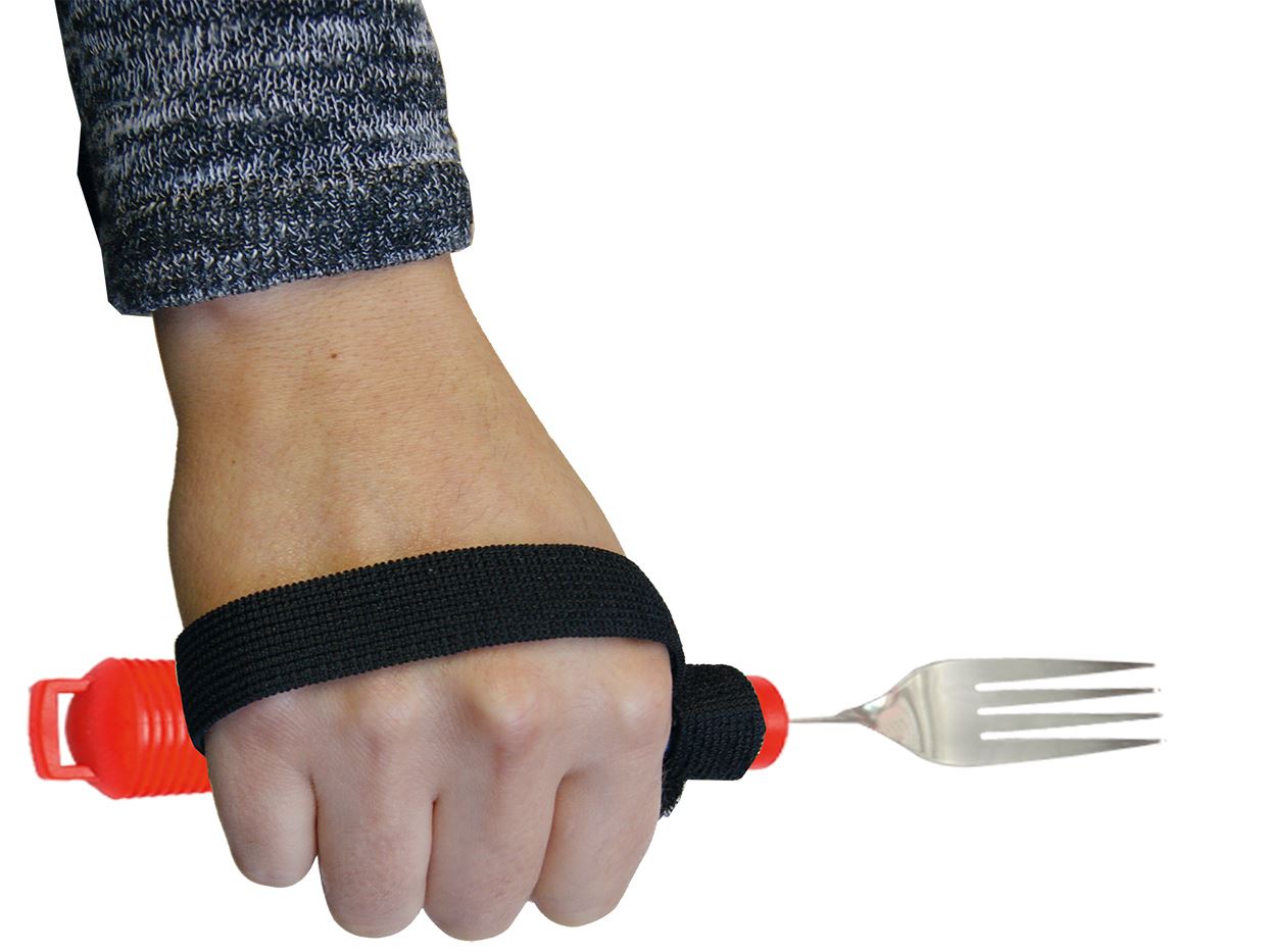 Remienok na ruku pre stabilné uchytenie príboru so suchým zipsom pomáha pri sebaobsluhe počas konzumácie jedla.