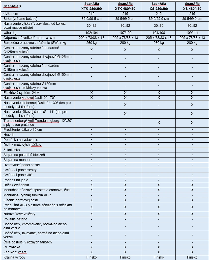 Kvalitné nemocničné lôžko ScanAfia XS a XTK je bezpečnou voľbou pre nemocničné oddelenia. Posteľ bola navrhnutá pre použitie zdravotníckymi pracovníkmi v nemocniciach, zdravotníckych strediskách a podobných zariadeniach a spĺňa požiadavky novej normy EN 60601-2-52:2010 pre zdravotnícke lôžka.