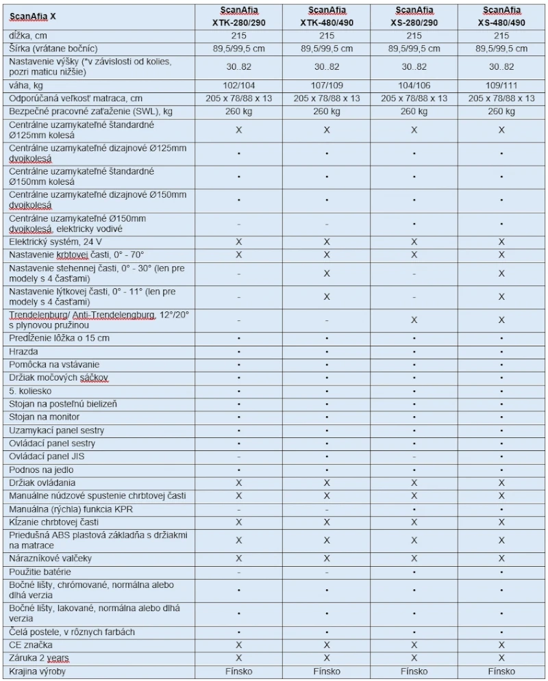 Kvalitné nemocničné lôžko ScanAfia XS a XTK je bezpečnou voľbou pre nemocničné oddelenia. Posteľ bola navrhnutá pre použitie zdravotníckymi pracovníkmi v nemocniciach, zdravotníckych strediskách a podobných zariadeniach a spĺňa požiadavky novej normy EN 60601-2-52:2010 pre zdravotnícke lôžka.