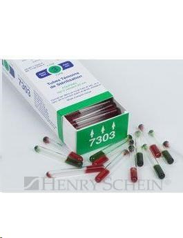 Sklenené trubičky s indikátorom horúcovzdušnej sterilizácie. Tekutina v trubičke, ktorá zatiaľ nebola použitá, má červenú farbu. Počas sterilizačného cyklu sa farba tekutiny mení z červenej cez oranžovú na zelenú.