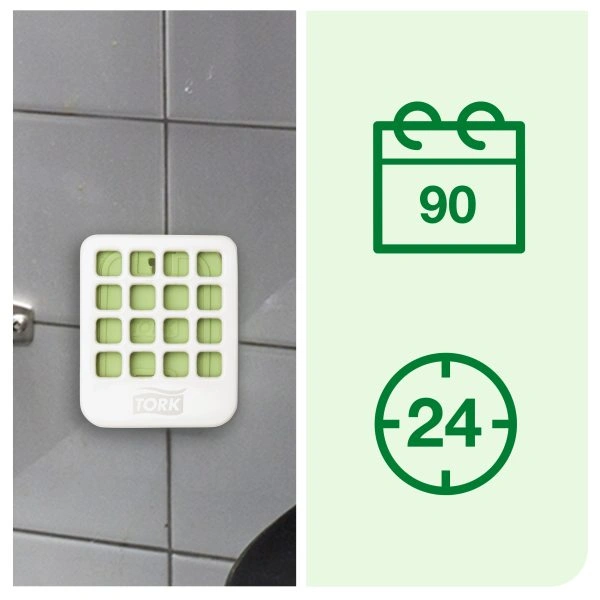Eliminujte nepríjemné pachy v umyvárňach vďaka pohodlným Tork Citrus osviežovačom vzduchu vo forme závesných tabliet. Impregnované gumové štítky uvoľňujú sviežu citrusovú vôňu, ktorá okamžite vytvára pozitívny dojem u návštevníkov. Jednoducho umiestnite tieto závesné osviežovače kdekoľvek je potrebné pre efektívne a účinné ovládanie pachov. Dlhodobá vôňa zabezpečuje sviežosť 24 hodín denne až na 30 dní, čím znižuje čas údržby.